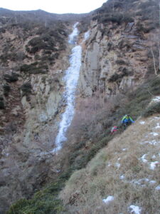 Cascata per principianti con soste attrezzate anche per le calata. Ghiaccio duro ma sempre presente e l’assenza di neve quest’anno a favorito la salita su tutta la linea